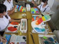 厚紙で型を作り、半紙を水のりで貼り、絵の具で色を付け、ニスを塗っていきます。